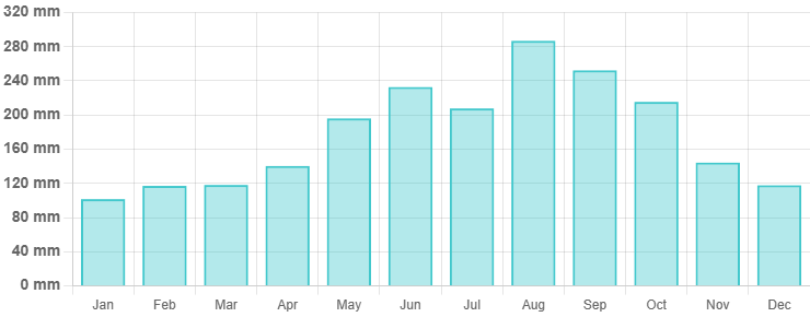 8월 평균 강수량은 약 200~287 mm, 비 오는 날은 17~20일로 월의 절반 이상 비가 내린다고 볼 수 있습니다. 다만 비는 대부분 스콜성으로 잠깐 내리고 맑아지는 패턴입니다. 일조 시간은 하루 평균 7–10시간 정도 확보됩니다.