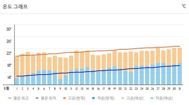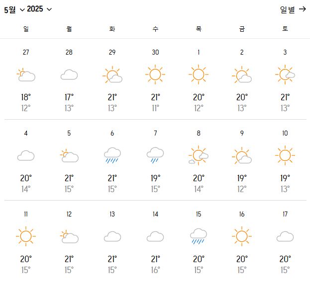 낮 최고 기온은 21~24℃까지 올라가는 날도 있으며, 한낮에는 얇은 긴팔이나 반팔 차림이 어울립니다. 아침과 저녁의 최저 기온은 13~15℃로 다소 서늘하므로, 얇은 바람막이나 가디건을 챙기시는 것이 좋습니다.