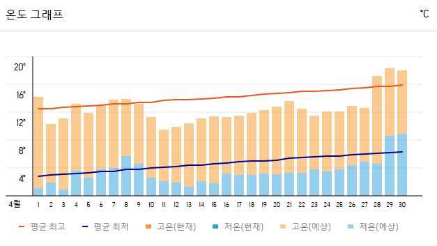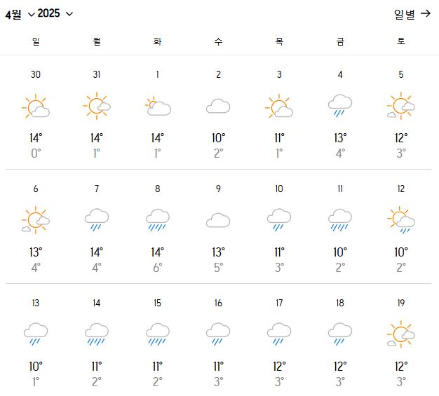 - 최저 기온: **1~4°C** (아침저녁으로는 여전히 추울 수 있음)