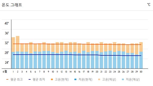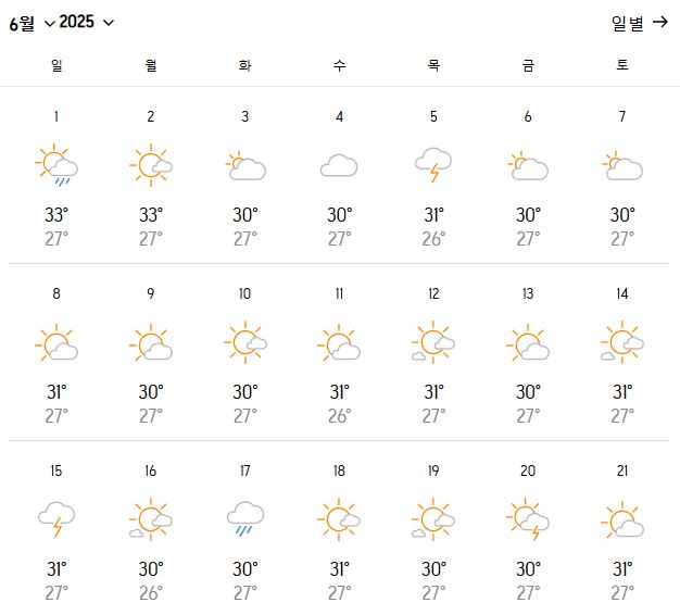 사이판의 6월 평균 기온은 28~29℃로 따뜻하고 습한 날씨가 이어집니다. 낮 최고 기온은 31~33℃, 밤 최저 기온은 26~27℃로 열대 기후답게 큰 일교차 없이 일정한 편입니다.