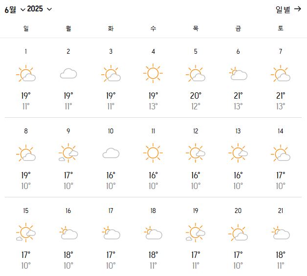 | 추천 옷차림 | 긴팔, 얇은 점퍼, 바람막이 |