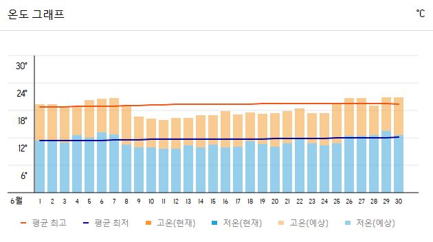 6월 평균 기온은 14~17℃로 매우 선선한 편입니다. 낮 최고 기온은 18~21℃, 밤 최저 기온은 11~13℃ 정도로 일교차가 꽤 큽니다. 특히 해가 진 후에는 바람이 세고 추워질 수 있어 얇은 패딩이나 바람막이가 필요합니다.